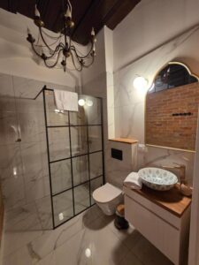 Na 30 m² czeka nowoczesna, klimatyzowana przestrzeń zaprojektowana z myślą o relaksie. Wnętrze obejmuje duże, komfortowe łóżko podwójne, płaski telewizor z dostępem do serwisów streamingowych, bezpłatne Wi-Fi oraz prywatną łazienkę z prysznicem, suszarką do włosów i zestawem kosmetyków.